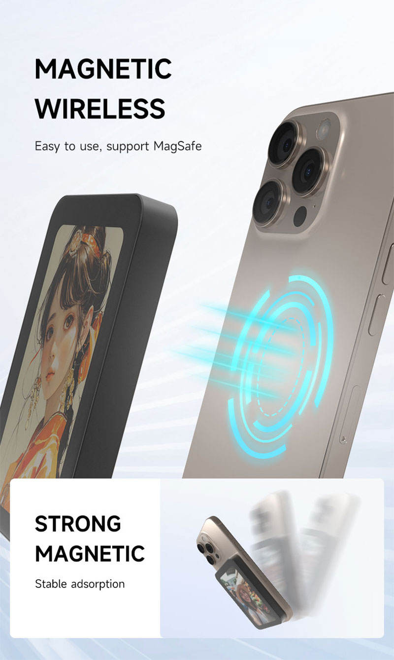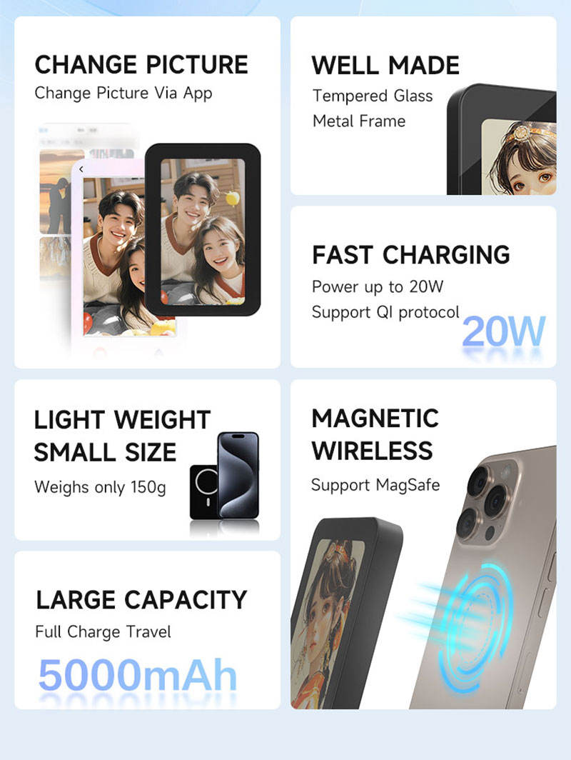 This AI Power Bank with E Ink Screen is designed forwireless fast charging, supporting up to 20W output power. Its5000mAh capacityand portable design make it ideal for on-the-go use with devices like iPhones. The built-in E Ink screen providesreal-time monitoringof battery status. Equipped with Type-C input and output interfaces, it ensures easy integration androbust connectivity. Over-charging and short circuit protection enhance safety. Lightweight ABS material ensures durability while offering flexible customization options for B2B buyers.